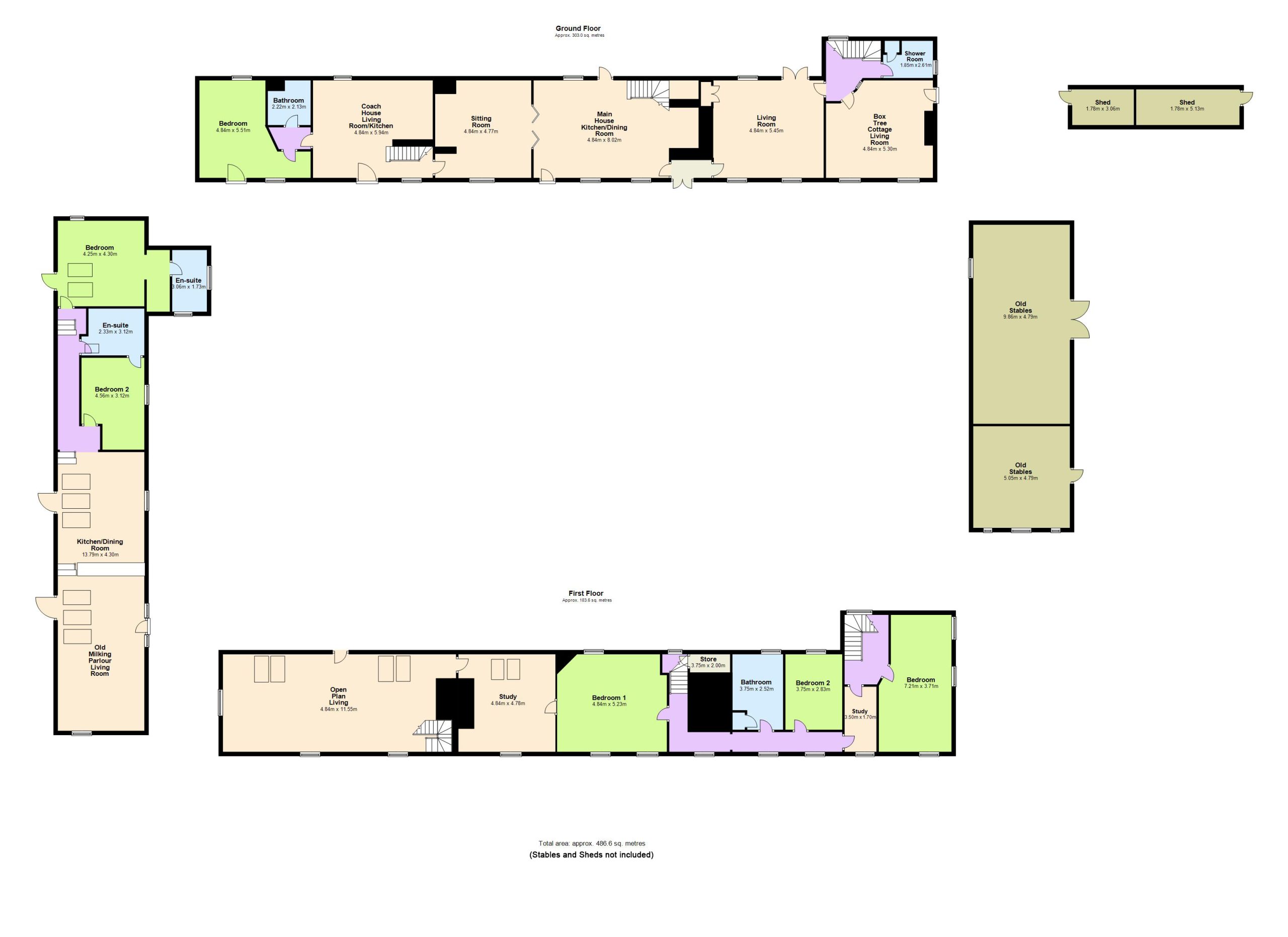 The main structure currently incorporates three self-contained homes, having been cleverly and sympathetically separated over the years to create flexible accommodation. Both Box Tree Cottage and The Coach House can be seamlessly reunited with The Farmhouse, by virtue of the fact that original doors are retained in place behind bookcases/cupboards and the like. Running perpendicular to the Farmhouse, the Old Milking Parlour, a fully self-contained unit with garden, forms the south frontage of the courtyard and opposite, the Old Stables create the north frontage, with garden and outhouses.
