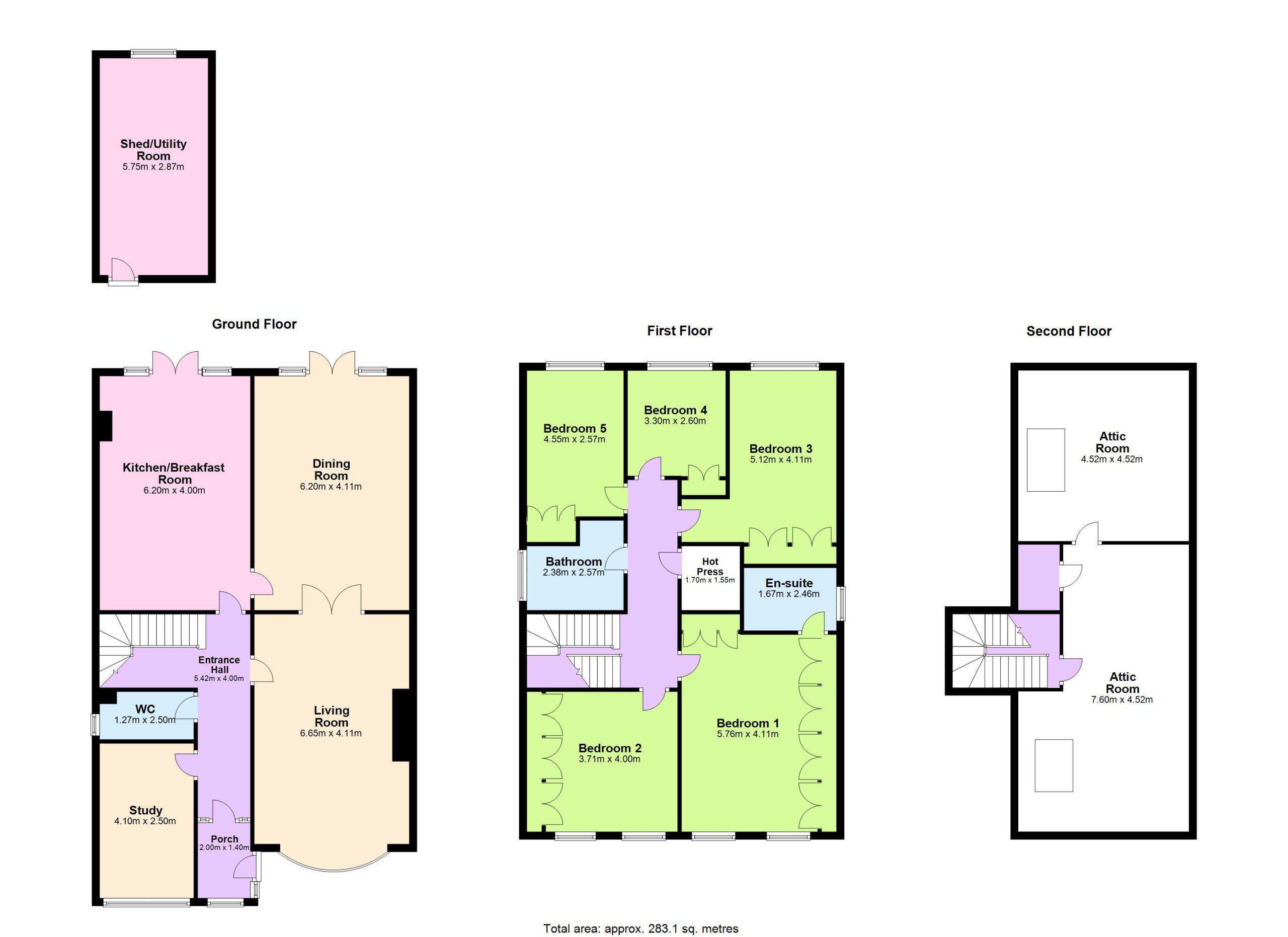 This deceptively spacious home benefits from five good-sized bedrooms on the first floor, all with fitted wardrobes. The sizeable main bedroom has a well-appointed en-suite shower room while a family bathroom and hot press completes the first-floor accommodation. From the first floor landing, the staircase contunues up to the expansive converted attic rooms providing an abundance of additional space. Laid out as two rooms, each with a velux window, this space could be further enhanced (subject to planning permission).