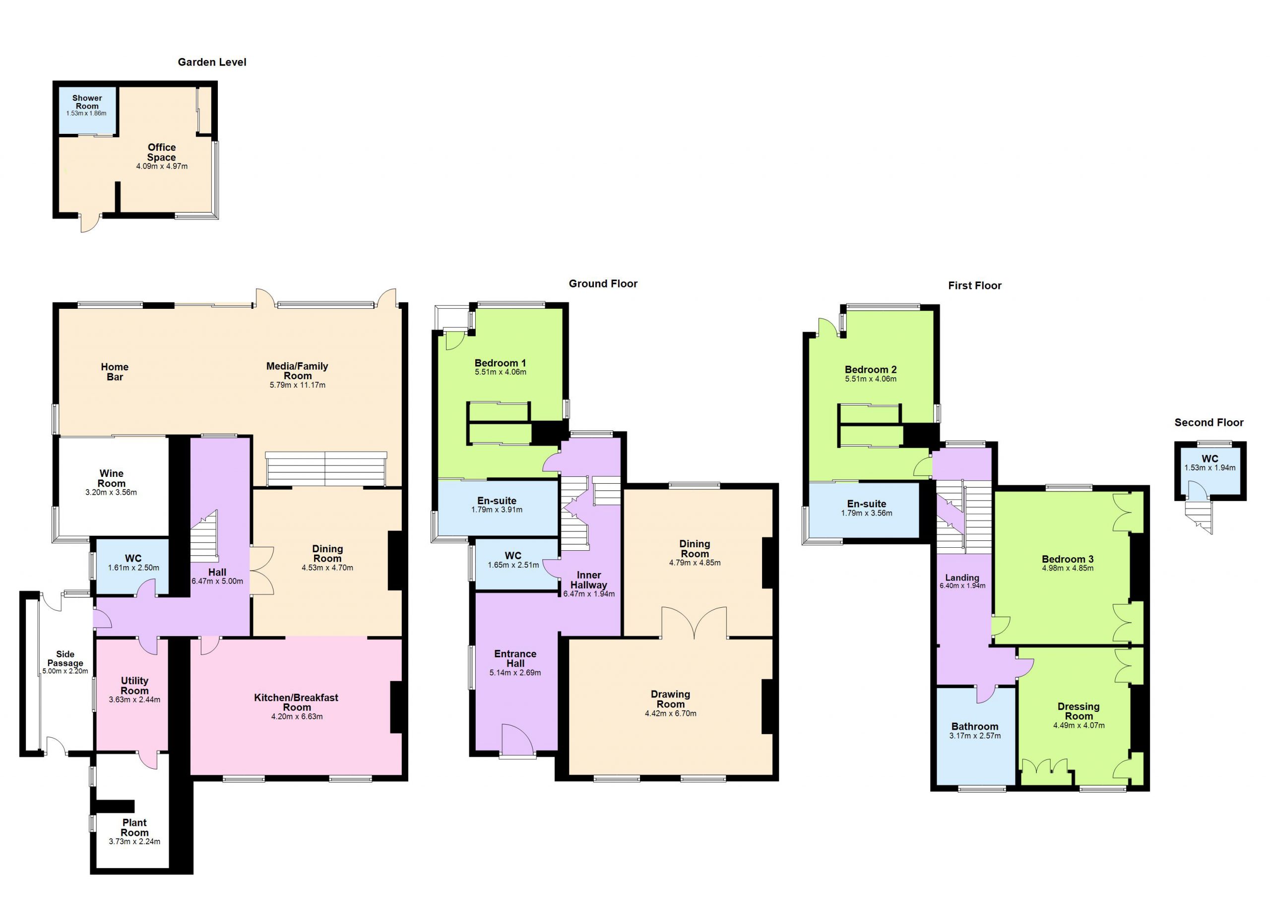 Impressive floor to ceiling glass sliding doors lead out to the rear garden and patio area. There is also a laundry/ utility room with fitted cabinets, sink, washing machine, dryer and coms cabinet, a state-of-the-art plant room and guest bathroom on this level and pedestrian side access to the garden. On the hall level return is a bedroom suite with walk through wardrobes, balcony looking on to the rear garden and luxurious en-suite bathroom finished to the highest standards with Samuel Heath sanitary ware, rain shower, towel radiators, bespoke oak fitted vanity units with marble top. The first-floor return replicates the ground floor with a bedroom, walk in wardrobe and ensuite all laid out in the same manner. The main bedroom is on the first floor, faces the rear of the property, while the fourth bedroom, presently used as a dressing room, is fully fitted also designed by Abington Design House faces the front of the house. Both rooms boast detailed features including the much-desired sash windows and marble fireplace. A luxurious main bathroom suite leads off the hallway, complete with a wall hung WC, bath, walk in shower and bespoke Jacobean reeded vanity unit with marble top.
