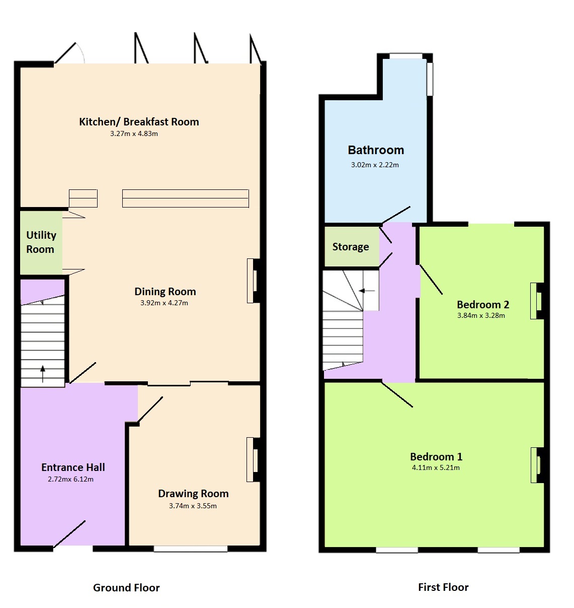 At first floor level, there are two generous double bedrooms, the expansive main bedroom spans the width of the property (could easily be sub-divided to create a third bedroom as required) with extensive built-in wardrobes and a feature cast iron fireplace. The luxurious bathroom with double sinks, corner bath and separate shower cubicle completes the accommodation at this level.