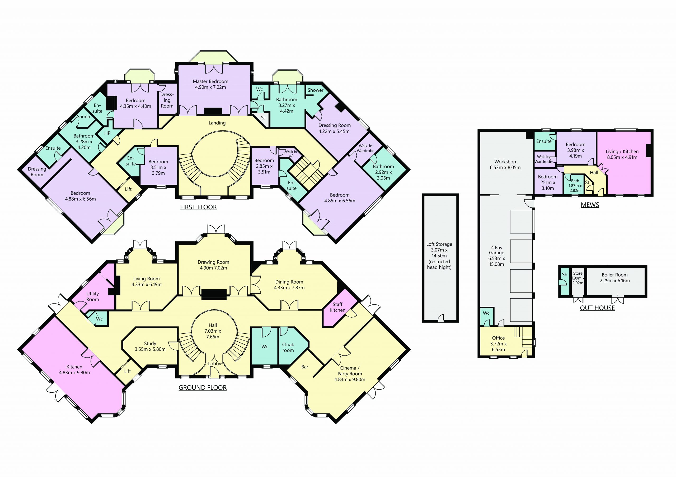 The left side of Castlefield House mainly comprises family living accommodation including a triple aspect country style kitchen with a central island unit and spacious eating area. There are excellent sea views from the kitchen and doors opening out onto the cobbled courtyard. Adjacent to the kitchen is a large utility room. There is also a five person mural adorned lift to the first floor. There is also a living/TV room opening on to a patio area. The first floor comprises six bedrooms, the master suite with French doors to the balcony overlooking the gardens, with a marble adorned bathroom with double sinks, a roman style bath with built in TV and a separate shower and steam room, this then leads into a dressing room. The further five double bedrooms all benefit from well-appointed shower rooms. Four of the five bedrooms benefit from walk in wardrobes while there is an additional bathroom with a sauna. There is considerable amounts of space in the attic above, ideal for a variety of uses.