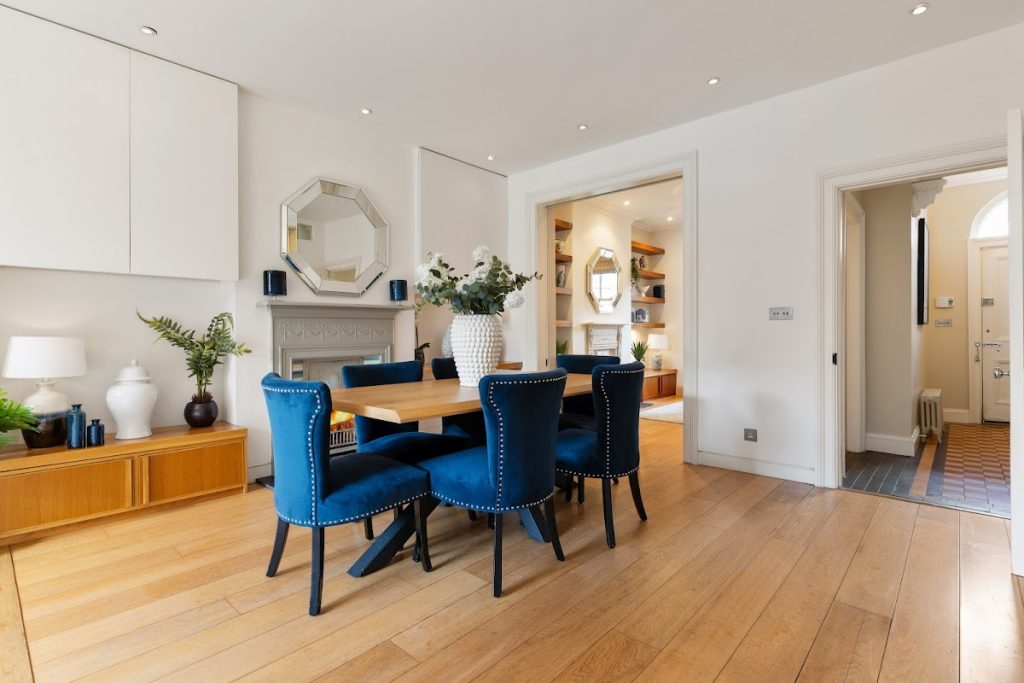 Internally, the light filled accommodation extends to approx. 110 sq. m. / 1,184 sq. ft. and comprises a bright and welcoming entrance hallway with tiled floors and original ceiling coving. To the right is a gracious drawing room with feature open fireplace flanked by alcove shelving and pocket doors through to a spacious open plan living room / kitchen / dining room with glazed accordion doors to the rear patio garden and a very cleverly concealed utility area.