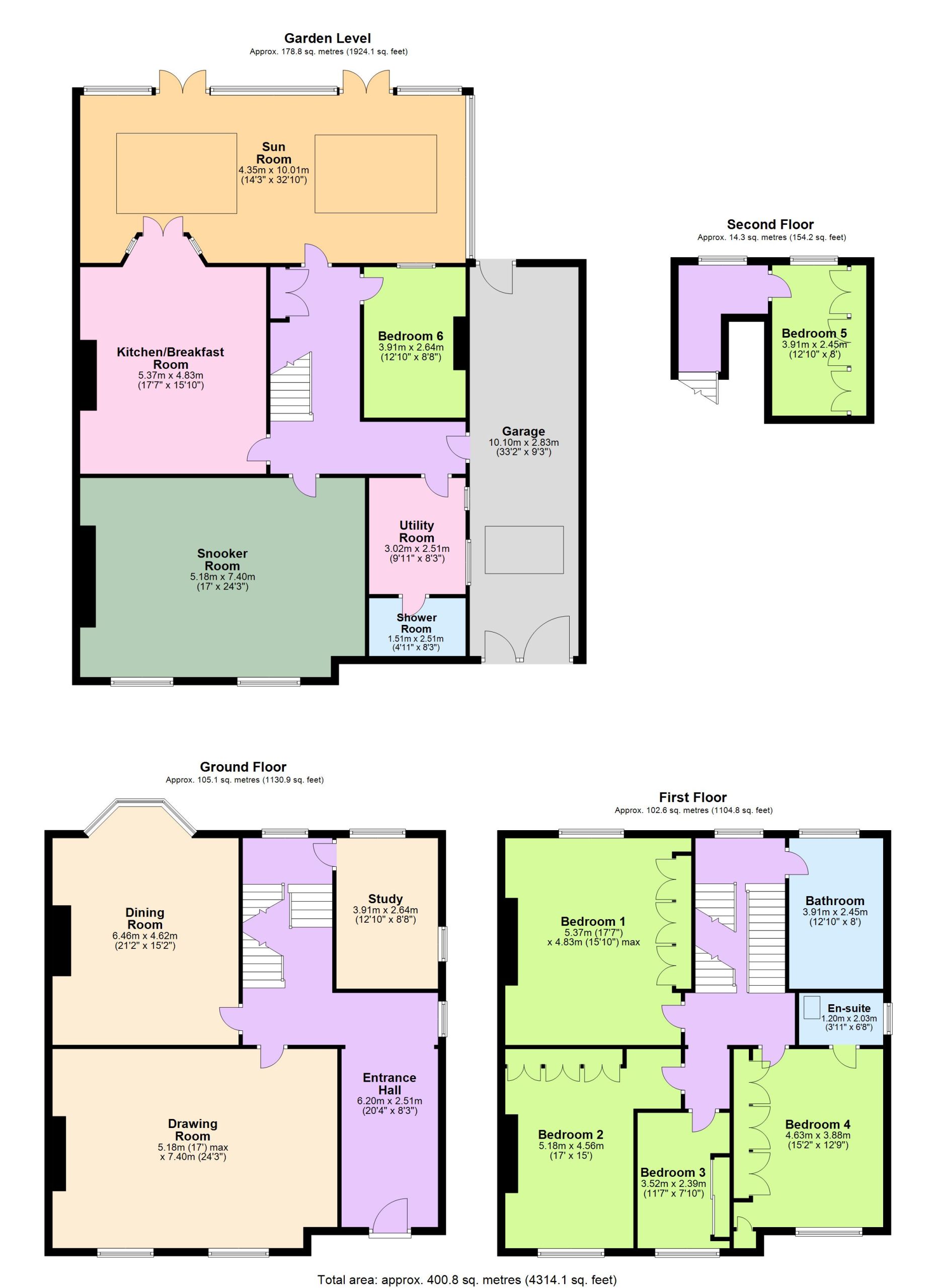 The substantial garden level comprises a snooker room, a utility room with adjacent shower room, a bespoke painted timber kitchen with centre island and a Waterford Stanley gas range which opens into a fabulous orangery laid out as a living and dining room offering wonderful views over and access into the garden. Additional garden level accommodation includes a sixth bedroom and a sizeable garage to the side with front to back access offering significant amounts storage. No. 7 is presented in good decorative order throughout and has clearly been very-well maintained throughout the years.